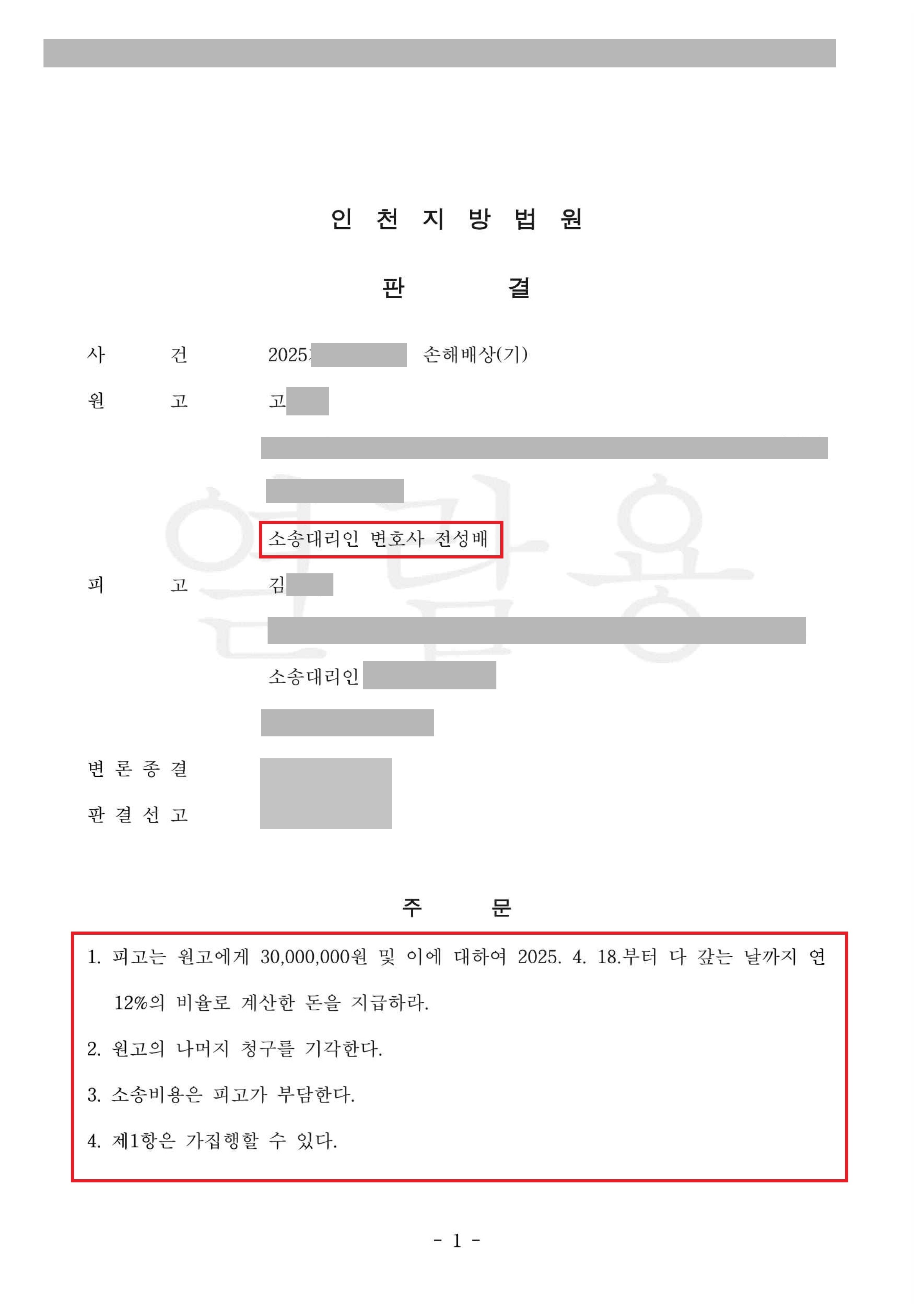 ¹ý¿øÀº Çǰí¿Í ¹è¿ìÀÚÀÇ ºÎÁ¤ÇàÀ§ ³»¿ë, ±â°£, ±×¸®°í ¿ø°íÀÇ È¥ÀÎ ±â°£°ú ÀÚ³à °ü°è µî Á¦¹Ý »çÁ¤À» Á¾ÇÕÀûÀ¸·Î °í·ÁÇÏ¿© 3,000¸¸ ¿øÀÇ À§ÀڷḦ »êÁ¤Çß½À´Ï´Ù. ¶ÇÇÑ, ¼Ò¼Ûºñ¿ë±îÁö ÇÇ°í°¡ ºÎ´ãÇÏ°Ô ÇÔÀ¸·Î½á ¿ø°íÀÇ °æÁ¦Àû ºÎ´ãÀ» ´ú¾îÁÖ¾ú½À´Ï´Ù.